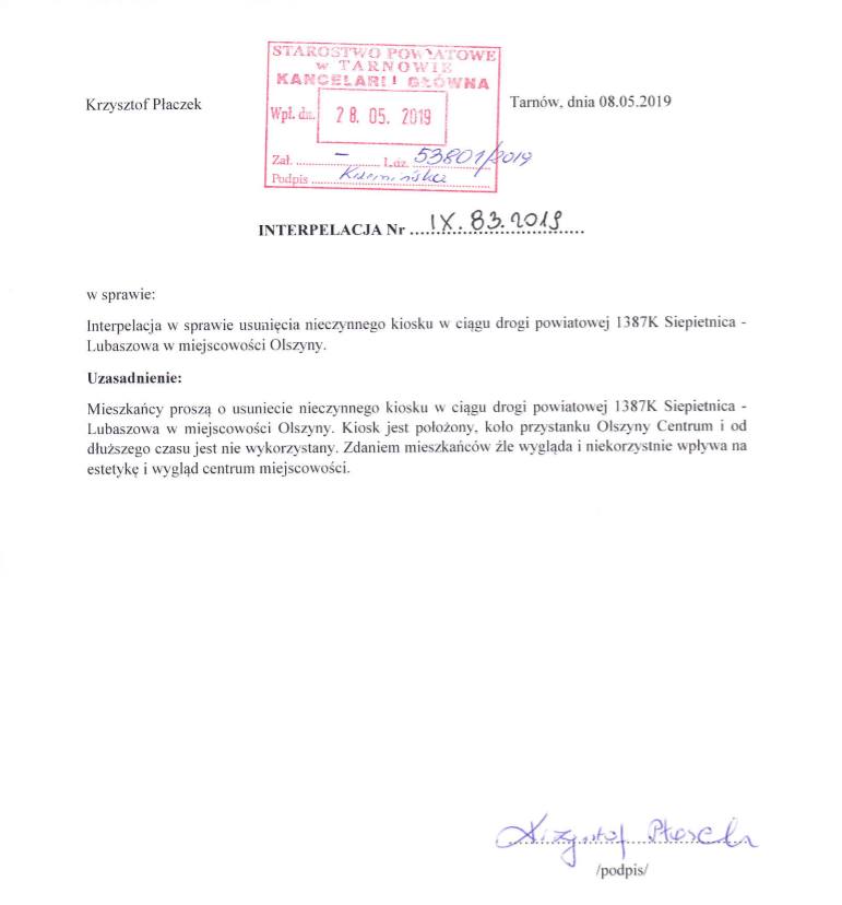 Kiosk od dłuższego czasu był nie wykorzystywany i niekorzystnie wpływał na bezpieczeństwo, estetykę i wygląd centrum miejscowości Olszyny.